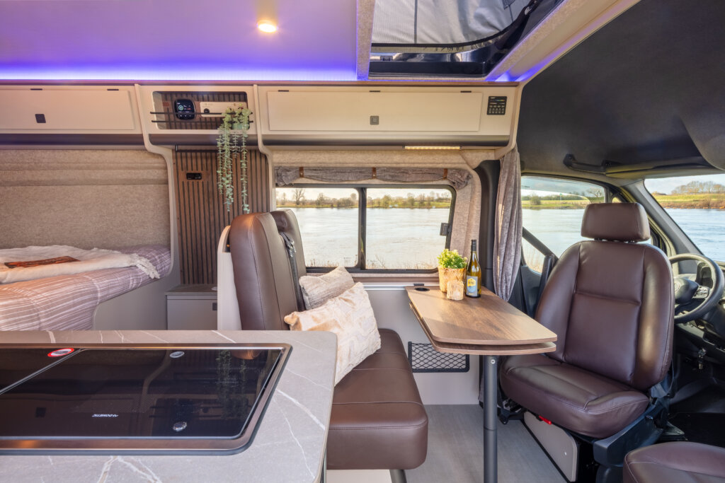 Het hefdak creëert twee extra slaapplaatsen, ideaal voor kinderen of kleinkinderen. Overdag blijft de camper ruim en overzichtelijk, en ’s avonds tover je eenvoudig extra bedden tevoorschijn. Zo kan het hele gezin comfortabel mee op pad.